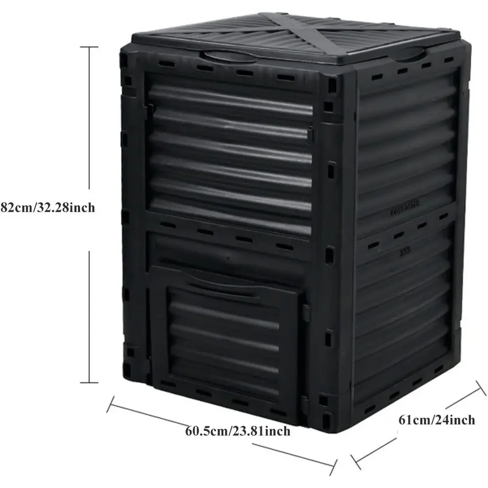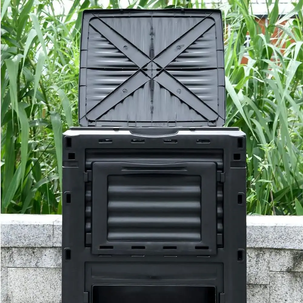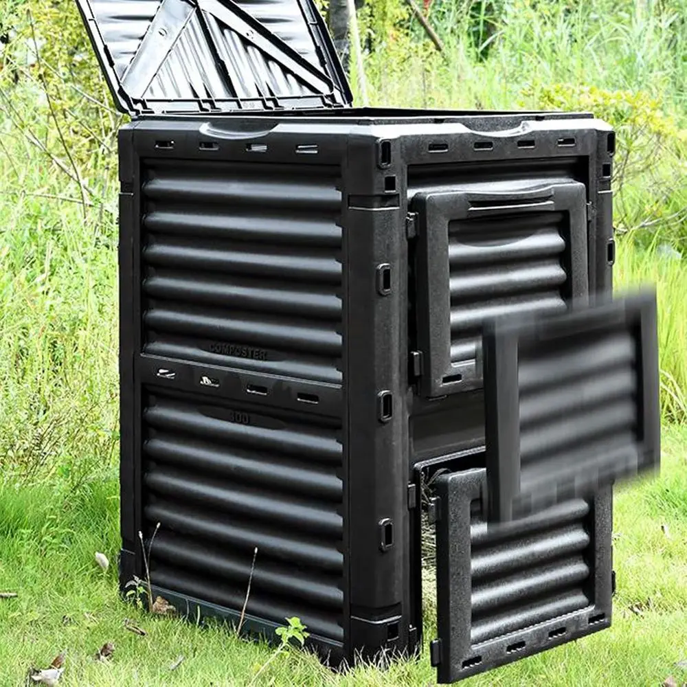 Fabricada en plástico de grado alimentario con protección UV, esta compostera está diseñada para uso exterior